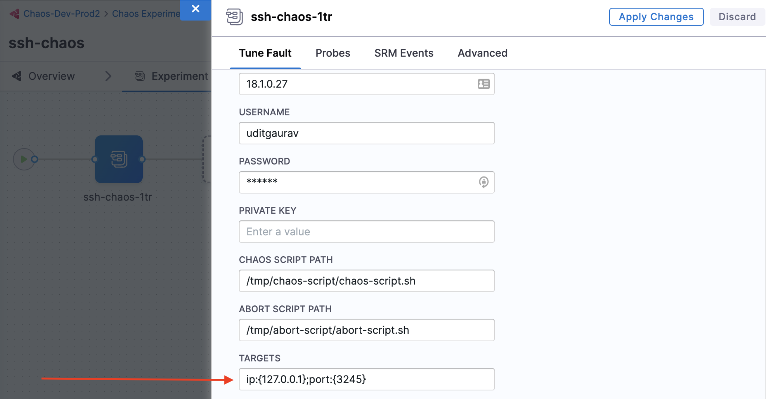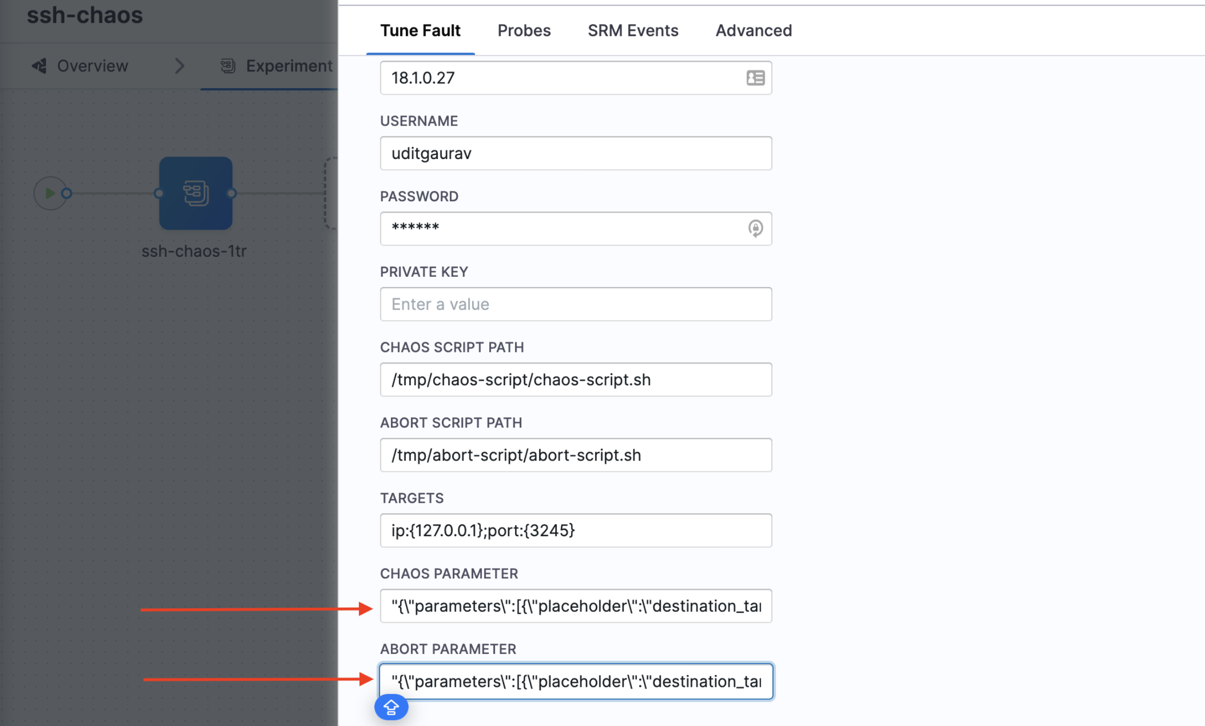 Consider the following example, that passes two parameters, an IP address and a port number to the chaos experiment.