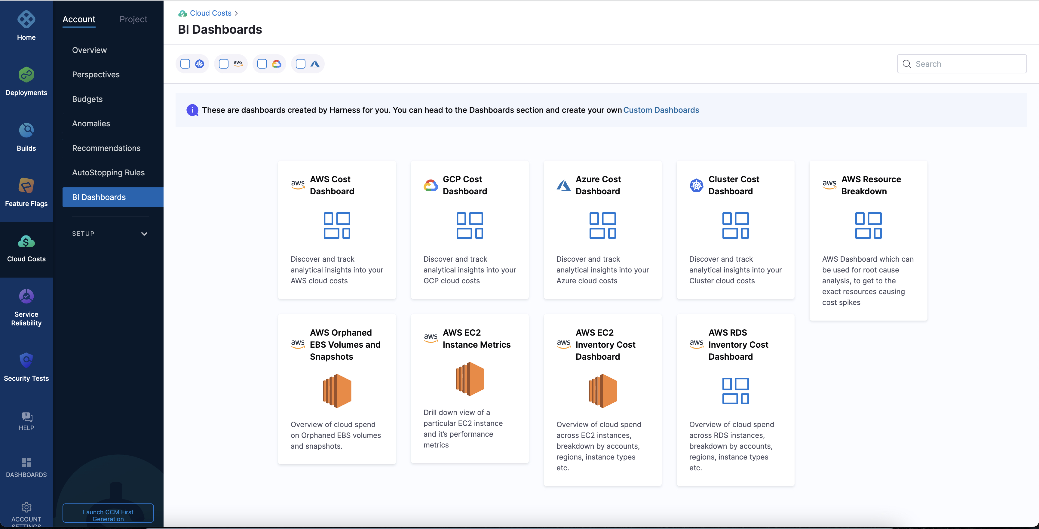 Harness provides pre-loaded By Harness (pre-defined) and Custom (user-defined) dashboards to visualize cloud cost data across clusters and cloud accounts.