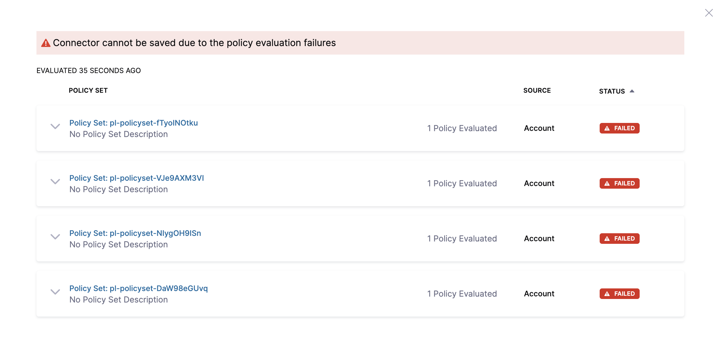 - Error and exit - You'll get an error and be exited without saving the Connector if the policy isn't met when the Connector is examined.