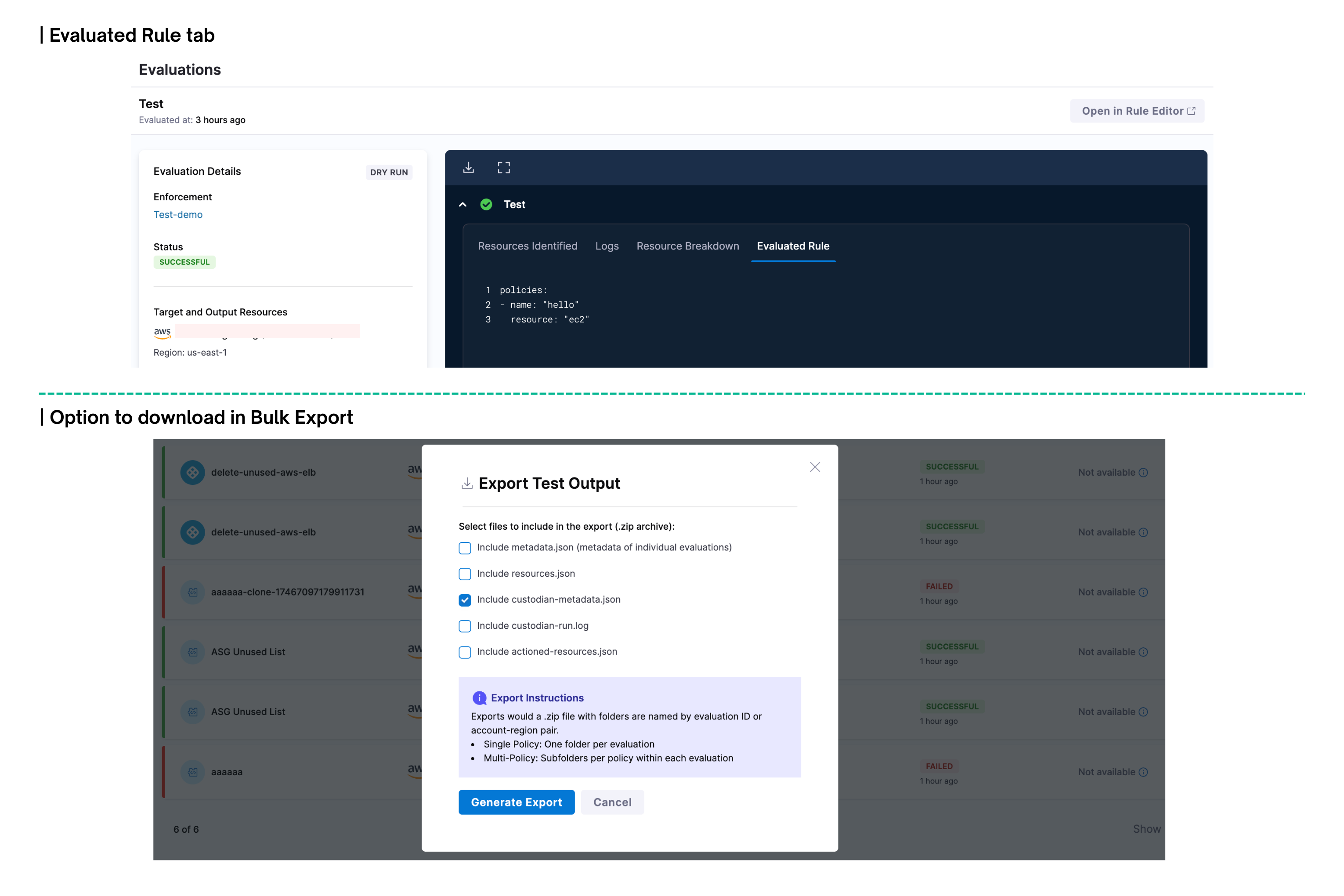 Enhanced Policy Evaluation Transparency We have added an Evaluated Rule tab in the Evaluation Output to display the policy YAML used for evaluation. An option "Include custodian-metadata.json" has been included in the bulk export functionality to export the metadata of the policies evaluated.