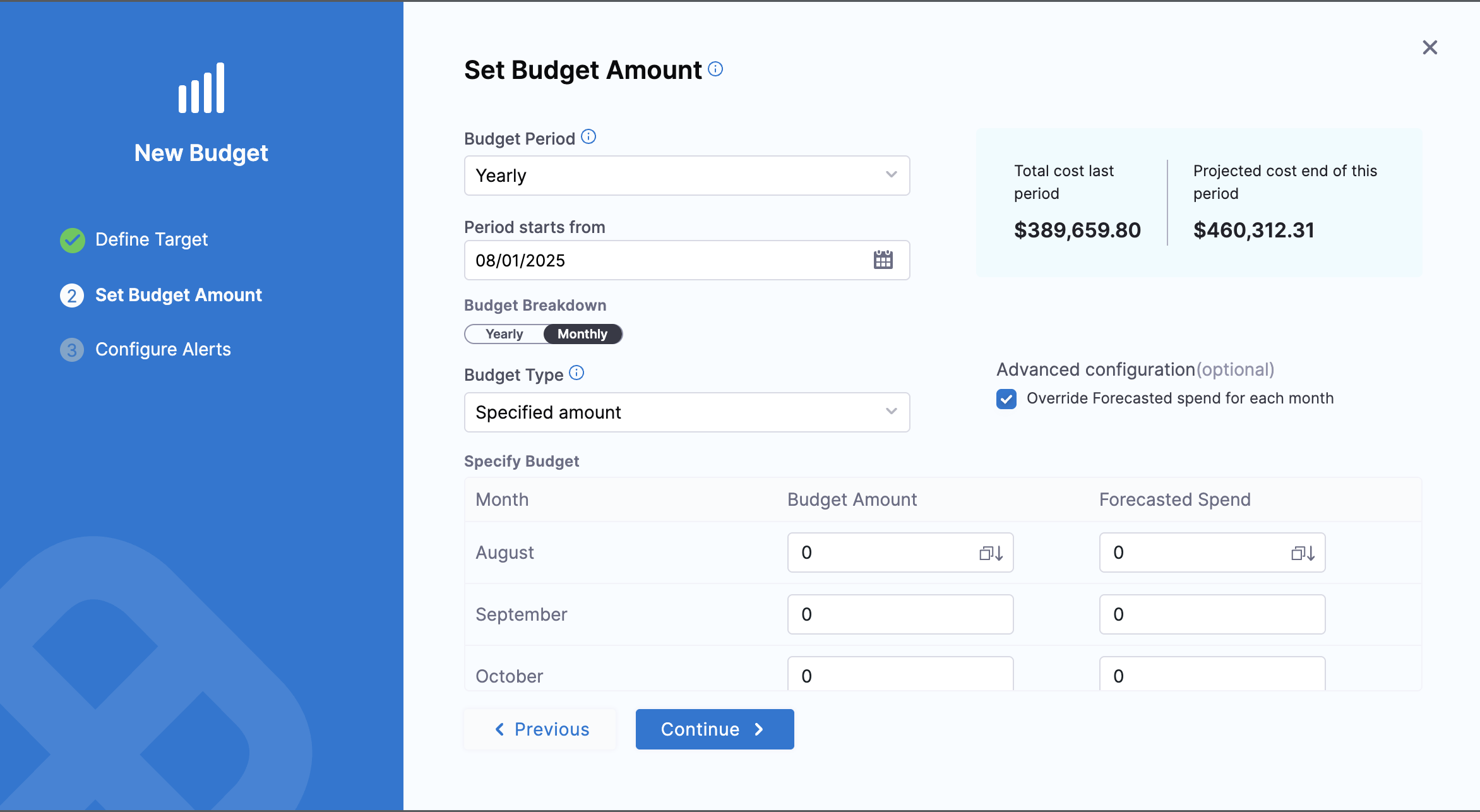 Budget Forecasting Enhancement: Added support for overriding forecast values in yearly budgets with monthly breakdown, providing more granular budget management capabilities. Also, improved the graph to show the forecasted values if override is enabled. [CCM-24440]