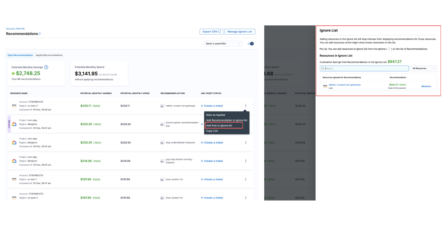 - Added support for Rule and Target Account Exclusions in Governance Recommendations, enabling you to define custom default rules that apply globally or to specific account subsets. This enhancement gives you precise control over which governance policies apply to specific accounts and which rules generate recommendations, streamlining compliance management across your organization.